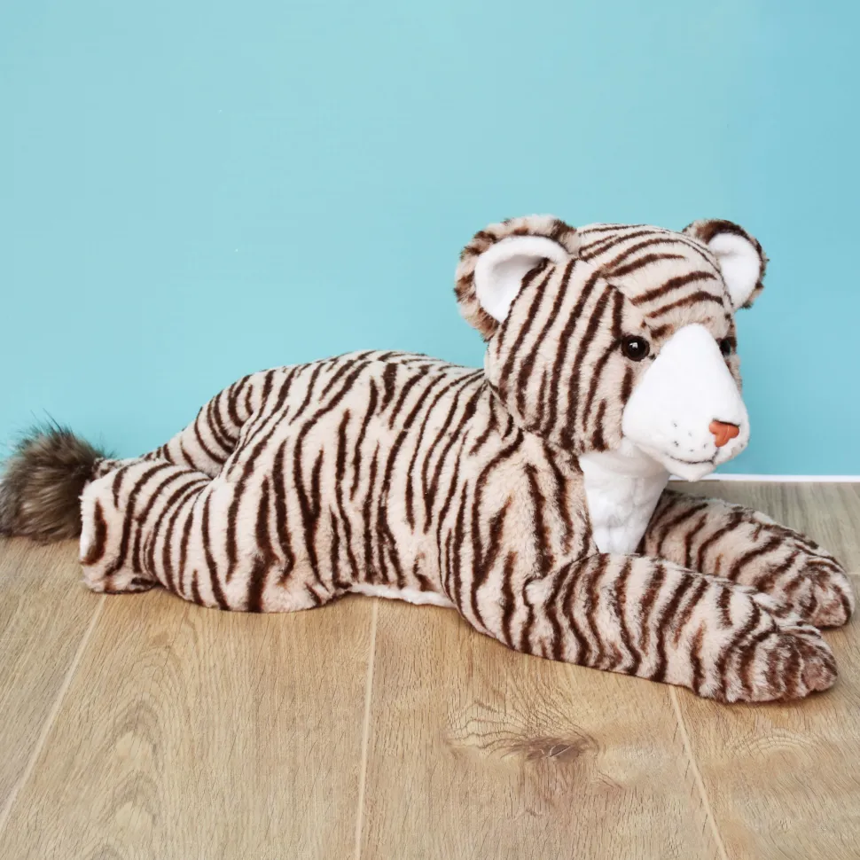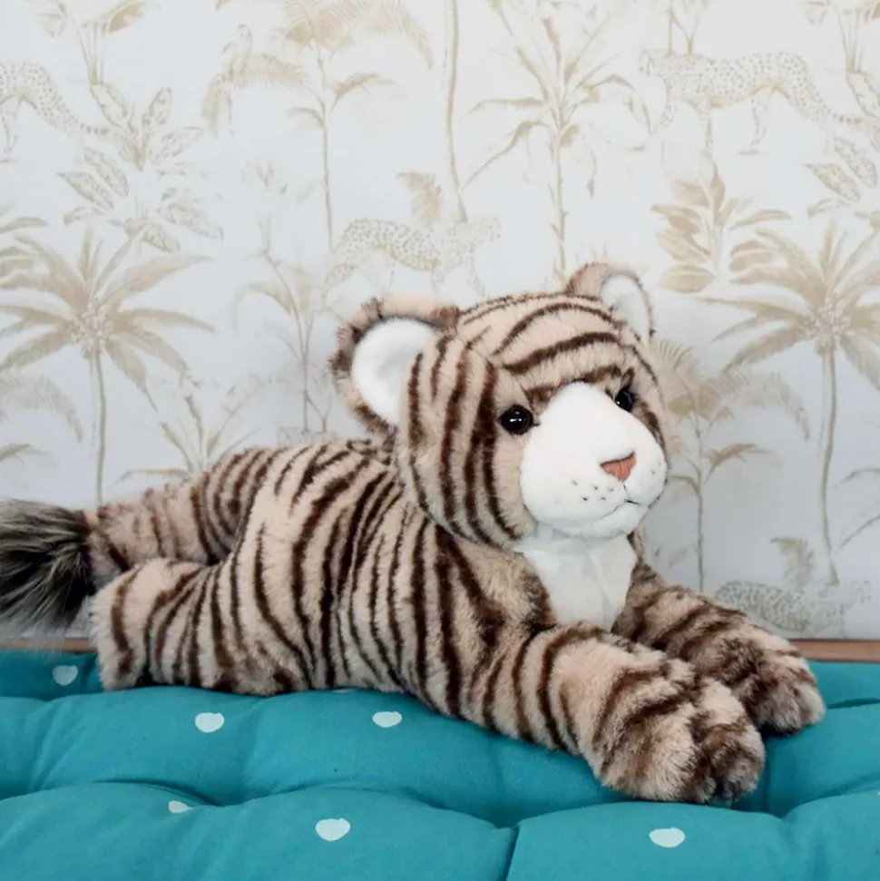 Au coeur de la jungle vit le plus grand félin sauvage … le tigre. Tapi sous les arbres ou parmi les herbes sèches, il est presque invisible. BENGALY LE TIGRE est un gentil gros chat aux rayures brun clair sur un pelage beige. Attendrissant avec sa bonne bouille et son nez rose, il est aussi très doux et facile à manipuler car très souple. Proposé en position couché, il est paisible et apaisant pour rassurer petits et grands. Parfait pour faire des câlins, pour jouer ou en déco, c’est un cadeau de naissance idéal.